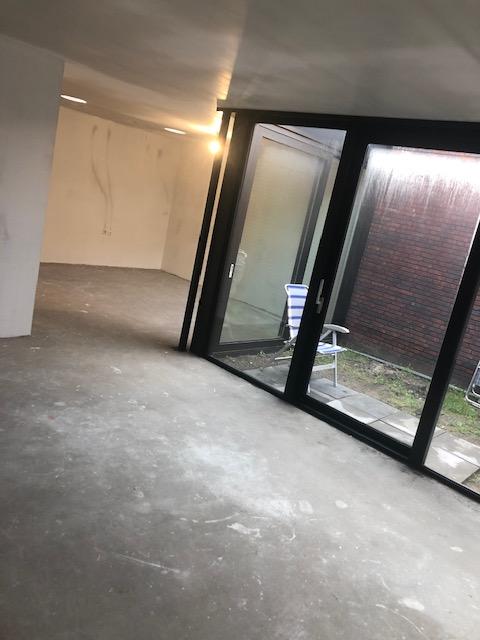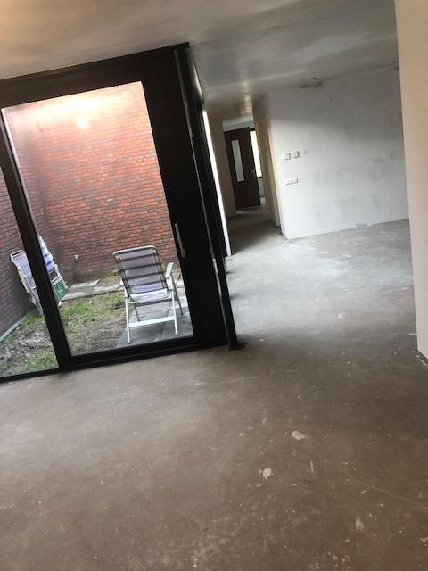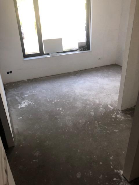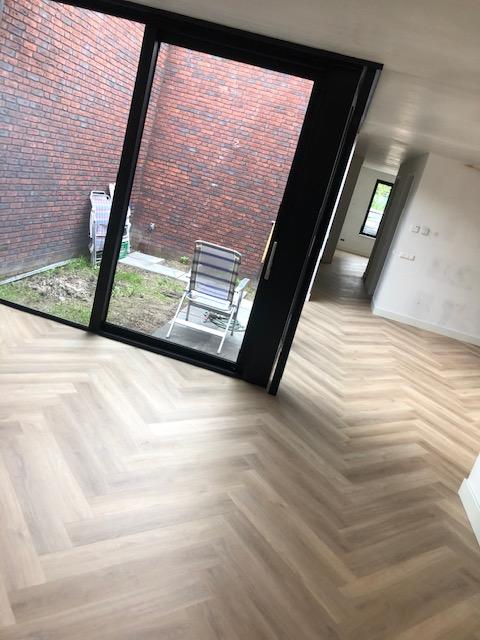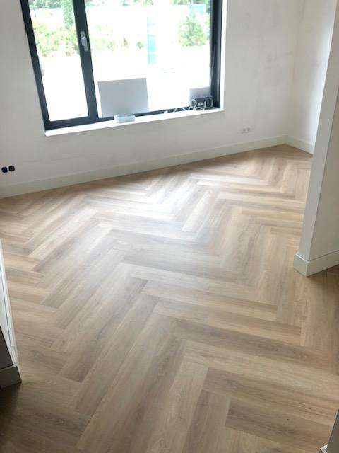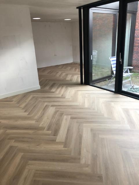 Egaliseren, pvc walvisgraat verlijmd en plinten plaatsen.