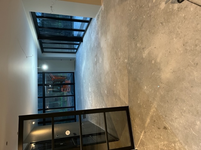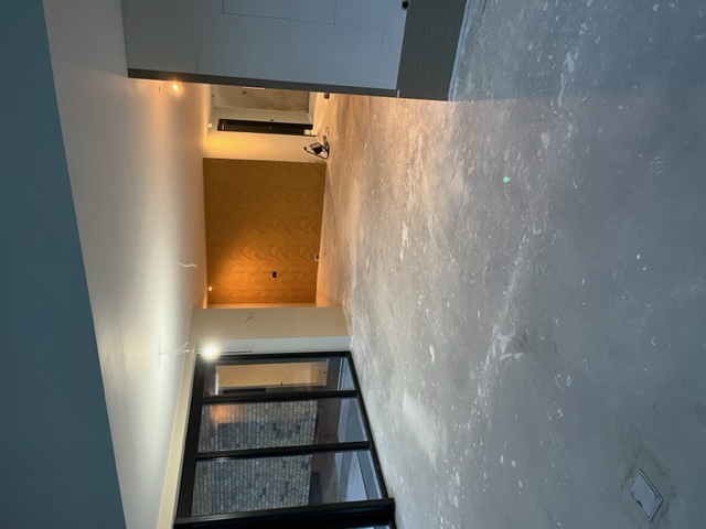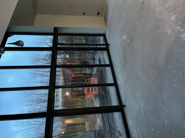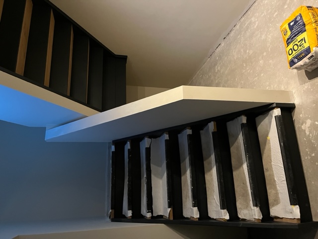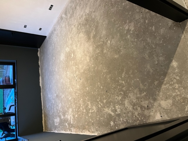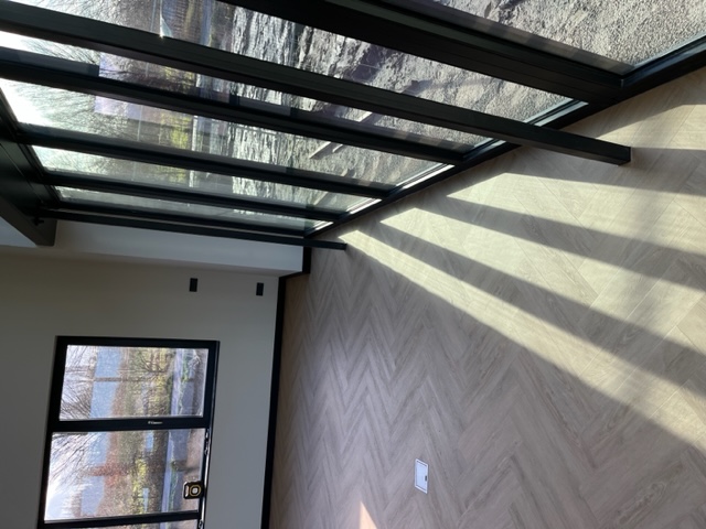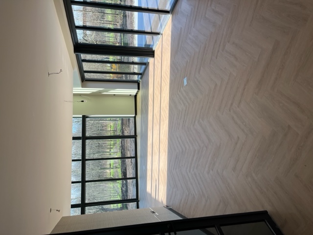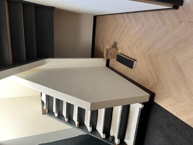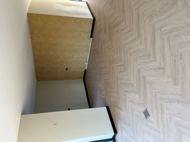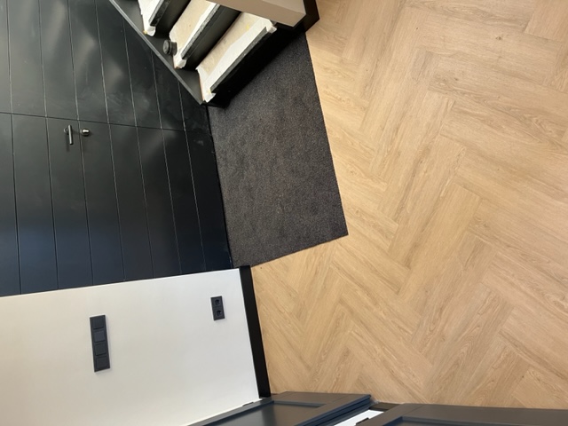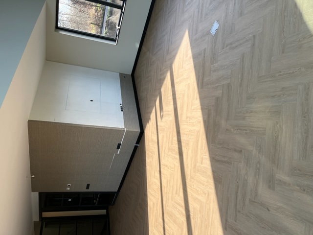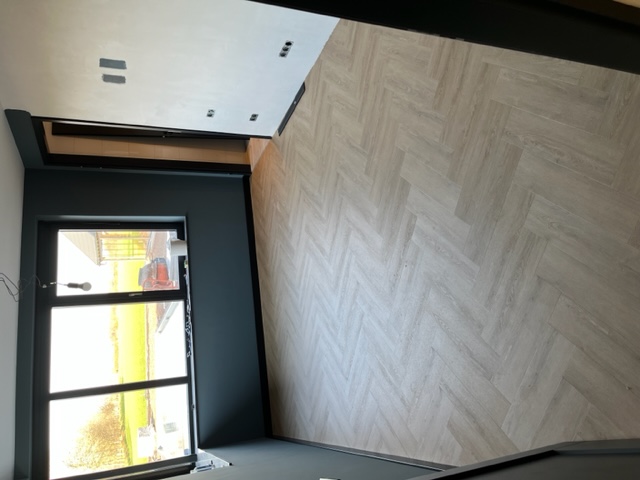Egaliseren, pvc visgraat verlijmd en plinten plaatsen.